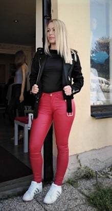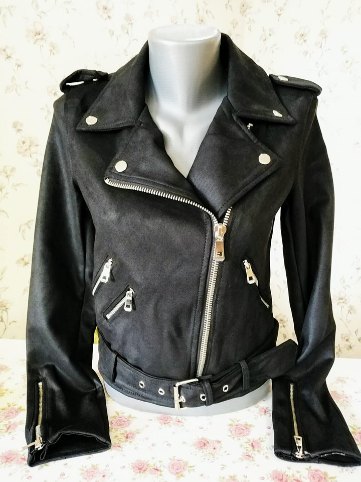 Krátka prechodná látková bundička v koženom moto vzhľade.